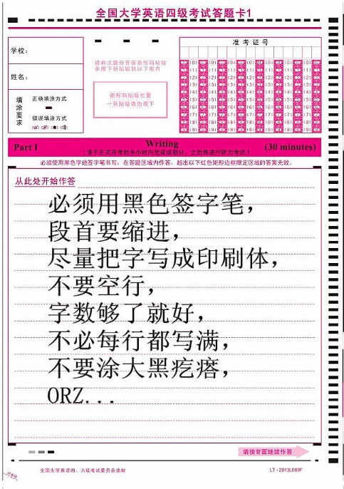 即将要走上四六级考场的各位亲,提前看一眼答题卡还是很有必要的,下面小编为大家整理了英语四级考试答题卡,同学们一定要注意要求,了解各题型所在位置以及排列的顺序,谨防填串行。听力需要边听,边做题,还要边填机读卡,真是难为你们了。同学们考试加油啊!