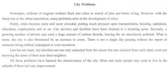 Directions: For this part, you are allowed 30 minutes to write a composition on the topic: City Problems. You should write at least 120 words .following the outline given below in Chinese: