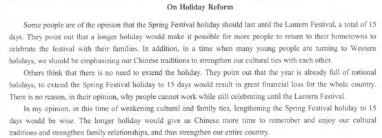 Directions: For this part, you are allowed 30 minutes to write a Composition entitled On Holiday Reform. You should write at least 120 words following the outline given below in Chinese: