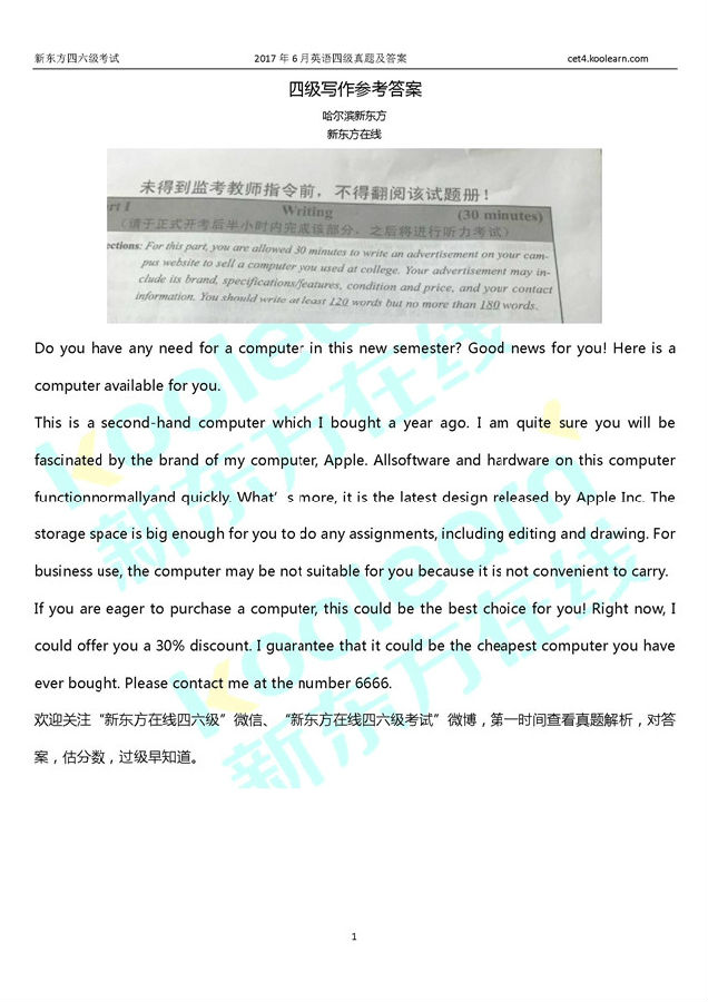 2024年6月英语四级考试已经在6月15日中午结束了,相信同学们想对下四级答案,估算下自己的四级成绩。新东方四级老师已经第一时间整理《