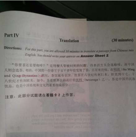 2013年12月英语四级考试已经结束,以下是网友提供的2013年12月英语四级翻译答案,供各位考生参考。 "你要茶还是咖啡?"是用餐人常被问到的问题,许多西方人会选咖啡,而中国人则会选茶...